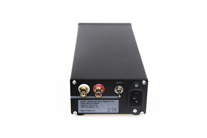 The elongated casing sports a 7mm aluminum front panel featuring a solid aluminum volume knob, headphone jack and an LED light whilst in the rear are a pair of solid RCA connectors and the power switch. The rear aluminum panel is 2mm thick and the amp stands on sturdy rubber feet.
